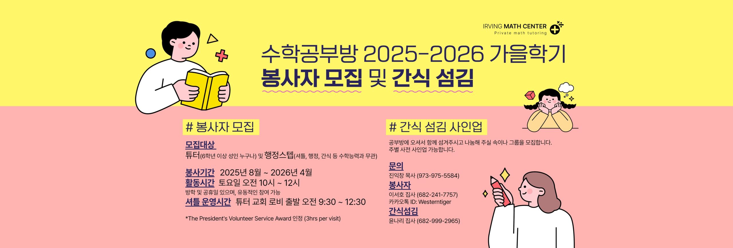 2025년 가을 학기 수학 공부방 봉사자 모집 및 간식 섬김 안내입니다.